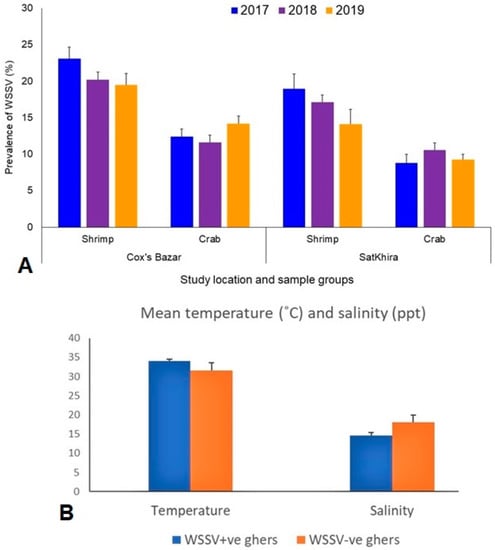 Prevalence of WSSV in Bangladesh. (A). The overall prevalence of WSSV in shrimp and crabs in two different regions (Cox’s Bazar and Satkhira) of Bangladesh during 2017–2019. (B) Mean temperature and salinity of shrimp ghers which differed significantly between WSSV+ve and WSSV-ve ghers.