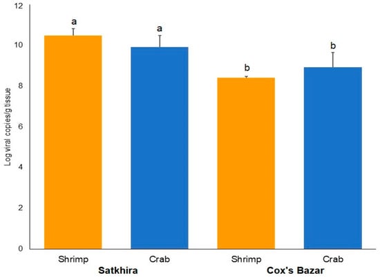 Viral load in crustacean (shrimp and crab) samples in Cox’s Bazar and Satkhira. Error bars represent standard deviation, and superscripts (a, b) represent significant differences (p < 0.05) statistical analysis.