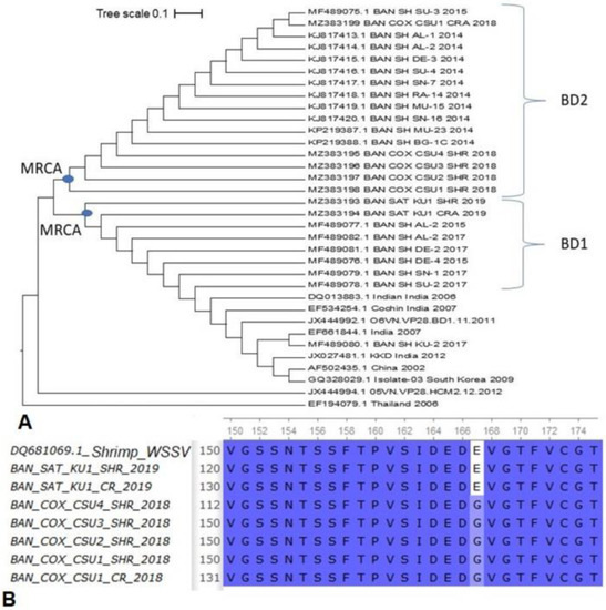 VP28 gene-based phylogenetic analysis. (A) Two phylotypes (BD and BD2) are currently circulating across the country. (B) Amino acid (aa) mutations in the VP28 sequences of WSSV.