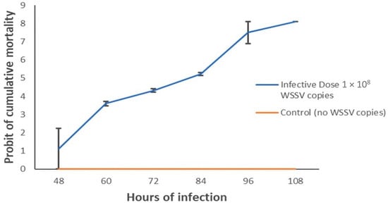 P. monodon post larvae (PL) were collected from Meghna Shrimp Hatchery, Cox’s Bazar, Bangladesh with a length of 1–2 cm. WSSV-free breeder wild-caught mother shrimps’ eggs were used for hatching these post larvae in the hatchery. Highly infected black tiger shrimp tissue was used for preparing WSSV inoculum. Tissue below carapace from affected shrimp was minced and homogenized in sterile sea water. Supernatant was collected after centrifugation at 8515× g for five min and filtered through a 0.45 µm membrane. Stock was diluted to prepare infective dose containing 108 copies per mL. Blank inoculums were prepared using the same steps from a WSSV-negative shrimp sample. For in vivo challenge, we performed the previously established ‘immersion technique’ [41] as waterborne inoculation [42]. The experimental groups were challenged by the immersion technique in aerated glass jars (n = 180, in each jar) with WSSV solutions in three treatments. Using the WSSV-negative inoculums, aerated jars were set to treat the negative control group (n = 180 in each jar) with three treatments. The PL were fed with commercially available artificial feed once a day at a rate of 10% body weight. Mortalities were checked after every six hours, and the presence of WSSV was checked by conventional PCR (Figure S1C).