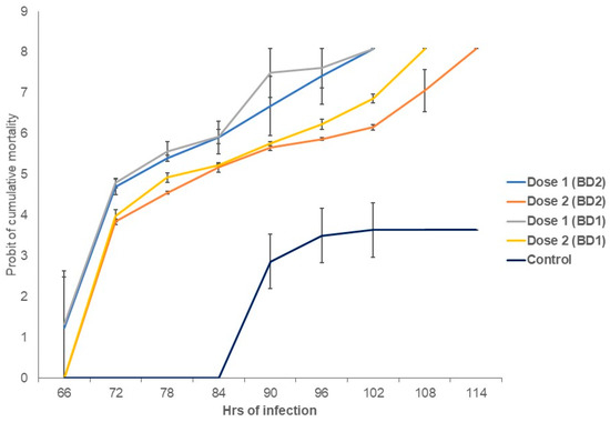 Probit of cumulative mortality after challenge with BD1 and BD2 phylotypes. The Y-axis represents the morality rates while the X-axis shows the h of challenge.