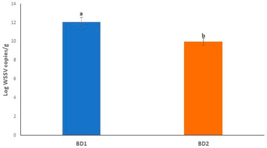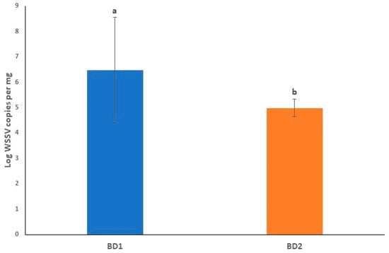 Log WSSV copies per mg of tissue infected with BD1 and BD2. Error bars and ‘alphabets’ represent the standard deviation and significant difference (p < 0.05), respectively.