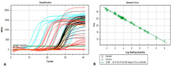 (A) Amplification curves targeting VP28 of WSSV and (B) standard curve produced using quantitative real-time PCR. Plasmid samples with known concentrations were used to obtain the standard curve, and copy numbers of unknown samples were calculated comparing Cycle Threshold (CT) values of samples and standards.