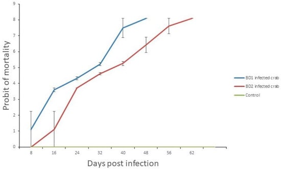 The LT50 and LT100 for infected crabs varied among the treatments, while no crab died in the control group. The experiment was run till 62 days post infection (dpi) as long as all crabs died in the experimental groups challenged with both phylotypes (BD1 and BD2) (Figure 9 and Figure S4). The LT50 and LT100 were 31 and 48 dpi in BD1-challenged crabs, and LT50 and LT100 were 40 and 62 dpi for BD2-challenged crabs, respectively. The mean viral loads in the crabs challenged with BD1 and BD2 were 12.06 ± 0.48 and 9.95 ± 0.37 per g of tissue, respectively (Figure 10, Table S2).