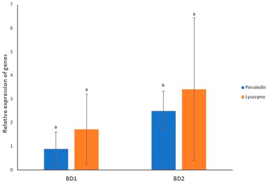 In the current study, two important immunity genes of shrimps, penaeidin and lysozyme, were considered for expression analysis, both of which are antimicrobial peptides (AMPs). Gene expression was observed after 73 hpi in this immersion challenge study. Figure 11 provides the average relative expression of penaeidin and lysozyme after exposure of shrimp PL to both the circulating phylotypes showing comparatively higher expression of lysozyme than penaeidin in both groups. While comparing the expression in the challenged groups, it was found that average relative expressions of these two genes were lower in BD1-challenged PL than in BD2-challenged PL (Figure 11).