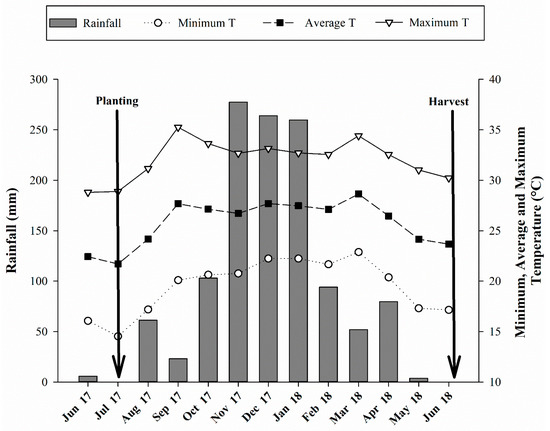 The experiment was carried out in the 2017/2018 crop season at Limoeiro Farm in an area belonging to Suzanápolis Sugar and Alcohol Mill in Ilha Solteira, located in the northwestern State of São Paulo, Brazil (Appendix A). The geographical coordinates are 20°21′14″ S latitude and 51°04′51″ W longitude with 371 m above sea level. The experimental area has been cultivated with highly degraded pasture (Urochloa brizantha) for over 10 years. The soil of the agricultural area was classified as a Latossolo Vermelho distrófico, from medium to sandy texture according to SiBCS [32], and Rhodic Haplustox according to the Soil Survey Staff [33]. The climate of the region is Aw, according to the Köppen scale, defined as humid tropical with a rainy season in summer and dry in winter. The climatic data regarding the experiment conduction period were properly recorded and are shown in Figure 1. The granulometry analysis showed 777, 98, 125 g kg−1 and 747, 88, 165 g kg−1 of sand, silt, and clay at the layers of 0.00–0.25 and 0.25–0.50 m, respectively, following the methodology of Embrapa [34]. The chemical attributes of the soil were determined before the experiment implementation and are shown in Table 1.