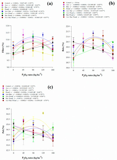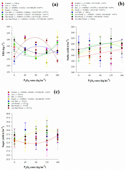 In the absence of phosphate fertilizer and the highest rate of P2O5 (180 kg ha−1), stalk yield (STY) and sugar yield (SUY) were not positively influenced by inoculation with PGPBs, alone or in combination, demonstrating that extremes were detrimental to obtain satisfactory results.