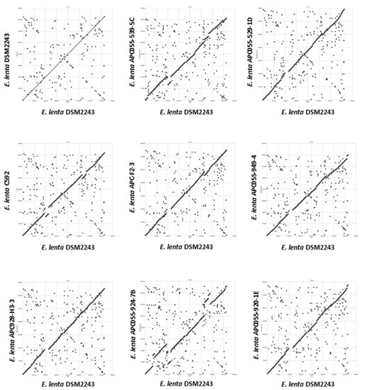 Genome assembly was performed using short and long-reads to obtain high-quality complete genomes for seven E. lenta isolates obtained in this study (Supplementary Information 1, Tables S1 and S2). Average sequence coverage for short and long reads being 1129 and 31-fold, respectively. Sequenced isolates were found to have an average genome size of 3.34 ± 0.246 mbp with a high GC content of 63.54 ± 0.95% (mean ± SD); these values are within ranges typically reported for this species [71]. Dot plot alignments were performed with the seven fully-sequenced genomes of E. lenta obtained in this study (APC055-539-5C, APC055-529-1D, APC055-949-4, APC055-928-H3-3, APC055-924-7B, APC055-920-1E and APC-F2-3) with those publicly available (C592 and DSM2243). Based on the obtained dot plots, variability is observed across members of E. lenta species, with general conservation of genome synteny. Occasional break points are observed at multiple chromosomal locations across the nine compared genomes, indicative of insertions/deletions events that occurred within the species (Figure 1).