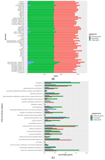 Dot plots illustrating genome alignment were created using MUMmer [36]. Average nucleotide identity was calculated using Pyan (v0.2.20) (ANIm) [37]. Genome annotation was conducted with Prokka v1.11 [38] utilising a protein database derived from strains DSM2243 and C592 obtained from the NCBI nucleotide database (https://www.ncbi.nlm.nih.gov/nuccore/, accessed on 2 March 2020), and all publicly available genomes sequences were obtained from the NCBI SRA database (https://www.ncbi.nlm.nih.gov/sra/, accessed on 2 March 2020). Pangenome analysis was conducted with Proteinortho (identity = 30%, coverage = 70%) [39]. Accumulation curves for pan and core genome were calculated by Proteinotho_curves (https://codeload.github.com/isabelschober/proteinortho_curves/, accessed on 2 December 2021). PanGP (v1.0.1) using the TR algorithm (sample size 500, sample repeat 10) was used to assess the openness of the pangenome (y = ApanxBpan + Cpan, where y is pan-genome size, x the genome number and Apan, Bpan and Cpan fitting parameters) with findings were interpreted by Heap’s law [40,41]. Determination of the function of bacterial orthologous groups was performed by RPS-BLAST (v2.2.15) against the COG database (2 January 2010) [42,43]. Phylogenetic analysis based on bacterial core genes was generated with ROARY(v3.13.0) and PRANK(v170427), while the construction of a phylogenetic tree was performed using FastTree [44,45,46].