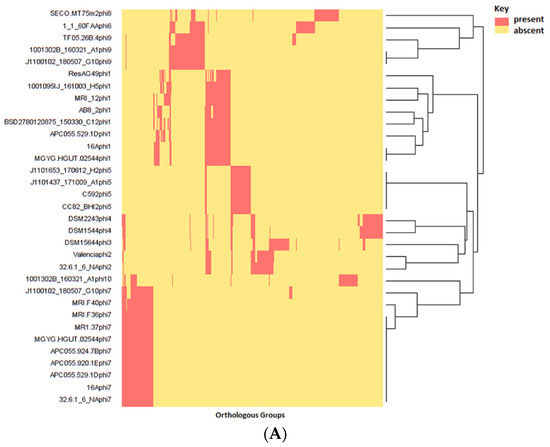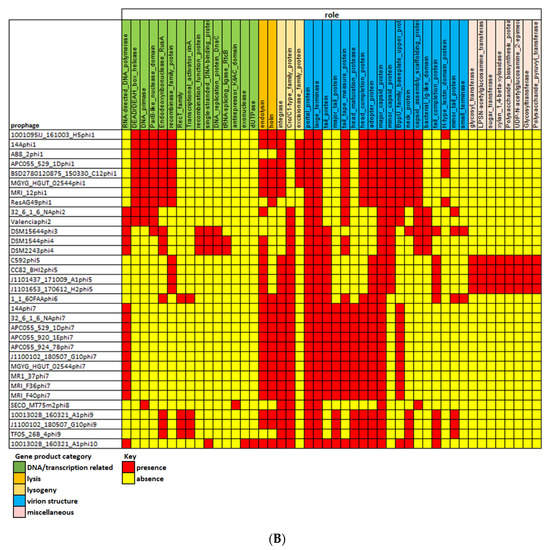 (A) Heatmap showing the distribution (presence–absence of OGs among prophages of E. lenta. (B) Heatmap illustrating genes detected among E. lenta prophages found with a particular function.