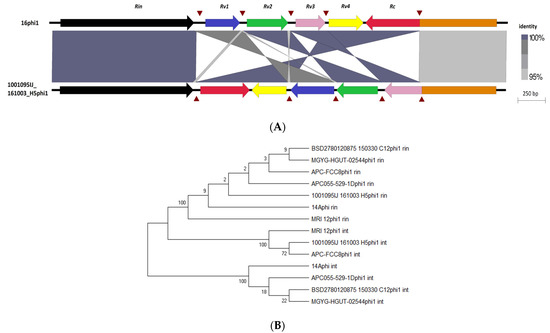 Characterisation of Rin shufflon among E. lenta prophages. (A) Locus map showing the alignment of the Rin shufflon among prophages 16 phi1 and 1001095IJ_161003_H5phi1, genes (arrows) relative to the direction of transcription and labelled accordingly to function. Brown triangles indicate repeat regions and shaded regions represent the degree of sequence homology in BLASTn alignments. (B) Unrooted maximum likelihood tree of invertases and intergrases among E. lenta clade 1 prophages.