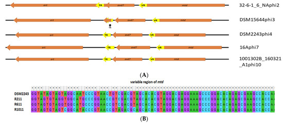 However, one interesting finding among this category of gene products was the detection of ORFs with gene products predicted to encode RNA-dependent DNA polymerase (IPR000477) that we term ert (Eggerthella reverse transcriptase) among prophage clades 2, 3, 4, 7 and 10, which appear to form a diversity generating retro (DGR) element. Among Bordetella temperate phages (BPP-1, BIP-1 and BMP-1), RNA dependent DNA polymerase has been demonstrated to act as part of a system that causes nucleotide substitutions with genes for virion proteins involved with host specificity, resulting in phase variation [84]. It is likely that a similar system exists among E. lenta prophages. Members of clade 7 prophages were found to be highly related at the nucleotide level (Figure 3 apart from the 3′ termini at the variable region (VR) of the mtd (major tropism determinant) gene located downstream of genes implicated in virion structural proteins. VR is a tandem repeat (TR) of a region located upstream of the 5 termini of ert that is 130 bp in size (BLASTn identity >90%). The architecture of this system in clade 7 Eggerthella prophages resembles that of the previously discussed Bordetella phages, even with a possible equivalent of the avd (accessory variability determinant) gene situated between the TR region and the mtd gene, the product of which complexes with Ert (the equivalent of Brt among Bordetella phages) and facilitates the DGR process [85]. The brt gene product utilising the TR region causes site-specific mutagenesis of the VR region [86]. This architecture of DGR with ert, mtd, predicted avd genes as well as the TR and VR regions, are similar among prophages in clades 3, 4 and 10. However, a slightly different configuration is observed among prophages of clade 2 (Figure 6A). Among these prophages, the TR region lies within the ert gene with this region being 123 bp long, where once again the VR region (BLASTn identity >90% to TR) is positioned towards the 5′ end of the mtd gene. Alignment of the VR regions between members of prophage clade 2 shows a high density of nucleotide substitutions. We could not assign a role to the mtd gene among these prophages, but it is suspected to play a role in virion structure due to their proximity to ORFs implicated with such function among these prophages. For Bordetella phage BPP-1, mtd has been identified to encode a protein that forms part of the tail fibre of the virion of this phage [87]. We were able to obtain evidence for the functionality of the DGR element of a clade 4 prophage associated with E. lenta strain DSM2243 (type strain). After fermentation in a chemostat (24 h as a batch, then 72 h as continuous), we isolated randomly selected colonies and subjected them to genome sequencing (average coverage >300). Analysis of the VR region of the mtd gene among such isolates shows nucleotide substitution at 10 different sites, enabling DSM2243phi4 to explore a sequence space of potentially up to 106 unique variants concerning this locus (Figure 6B). The finding also indicates that the system is active while the prophage remains in its lysogenic state.