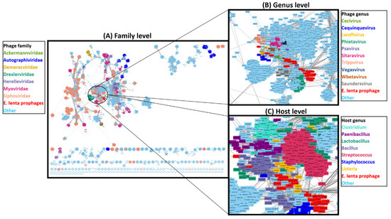 Network-based analysis of shared protein clusters with 33 E. lenta prophages with 12,892 phages visualised with Cytoscape. Each node represents a phage genome, lines (edges) represent the strength of connectivity (edge weight) between genomes. (A) Overview of network with nodes coloured to highlight family to which a phage belongs and a close-in view of the network of where E. lenta prophages are situated with nodes coloured to highlight (B) phage genus or (C) or host bacterium genus.