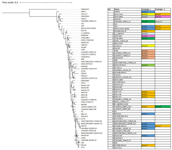 Screening of the pangenome of 57 E. lenta genomes for OGs encoding hallmark phage proteins (terminase, major head and portal protein) resulted in the identification of prophage-like elements in the genomes of 26 strains. In total, 33 prophages were identified with some strains found to possess up to two distinct prophages per genome (Table 2). Utilising progressive Mauve for sequence alignment of these E. lenta genomes with isolates DSM2243 or C592 (strains with publicly available complete genomes sequences) allowed determination of the approximate location of prophage termini. The genome sizes of complete prophages (those with approximate genome termini determined) were found to vary from 32 to 42 kb, with GC contents typically lower than that of their host ranging from 58 to 67%. In five cases, we could not identify prophage termini due to the incompleteness of host draft sequences. Gegenees derived BLASTn analysis allowed the clustering of these prophages in ten distinct clades, each sharing an identity of >60% across the whole prophage sequence at the nucleotide level, with a higher level of inter-clade relatedness indicated with a homology of >40% at nucleotide level between clades 6 and 9 (Figure 3). These prophage clades were further confirmed by sequence analysis of their proteomes and phylogenetic analysis using VICTOR (Supplementary Information S2, Figure S5). Of note, the most populated clades were 1 and 7, collectively representing more than half of the prophages identified.