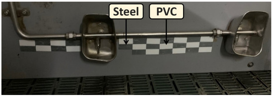 In this work, 60 coupons of each material were analyzed (120 coupons in total) side by side on pen dividers using double-sided tape under the water lines close to animals in five pens of 3.73 m per 2.5 m of 25 piglets each (Figure 1).