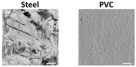 Characterization of the surface of coupons using confocal laser scanning microscopy. A detail of the surface topography of the steel and the PVC coupons by CLSM are shown (scale bar = 30 µm).