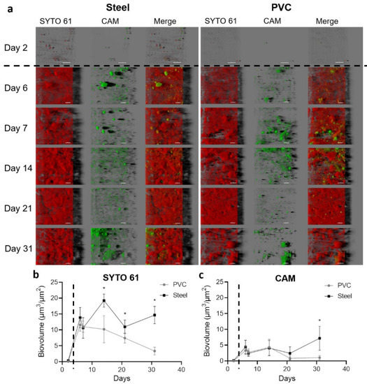 Confocal laser scanning microscopy visualization of biofilms settled on the steel and PVC coupons. Microorganisms and eDNA were labeled in red with SYTO61 and metabolically active cells in green with CAM. The easy 3D representative projections for each time point for steel and PVC coupons are shown (a). Day 2 corresponds to the first sampling, two days after the deposit of the coupons without animals in the farm; the scale bar represents 30 µm for day 2 and 40 µm for the other time points. The biovolume of SYTO 61 (b) and CAM (c) signals were extracted over time on PVC (grey lines) and steel (black lines). The dotted line indicates the animal’s entry into the building. Results represent average ±CI 95% (* p < 0.05).