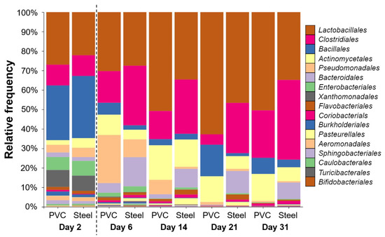 Taxonomic order profile of bacterial communities on the pig farm surface determined using PVC and steel coupons. Each color bar represents the relative frequency of one bacterial order inside the total bacterial community. For each day, PVC and steel taxonomic profiles are shown. The dotted line indicates the animal’s entry into the building.