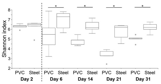 Comparison of α-diversity on PVC and steel coupons during the experiment. α-diversity was determined using the Shannon index value. The dotted line indicates the animal’s entry into the building. Pairwise comparisons between materials per day are shown with an asterisk (* p < 0.05).