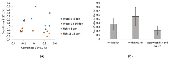 A PCoA ordination of the microbial communities in fish and water samples (Figure 2a) showed that the water and fish clustered separately. This was corroborated by Bray–Curtis similarities (Figure 2b). The PCoA plot also indicated that both the water and fish microbiota changed over time. There were significant differences between the water and fish microbiota both early (1/4–8 dph) and late (13–16 dph) in the experiment (one-way PERMANOVA, p = 0.04 and 0.01 for early and late, respectively) and also between water samples early and late in the experiment (one-way PERMANOVA, p = 0.01). There were no significant differences in the microbiota of fish samples early and late in the experiment.