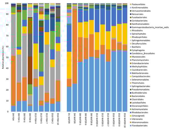 The results from PERMANOVA analysis are reflected in the taxonomic composition of the microbial communities at the order level (Figure 3). The relative abundance of Vibrionales was more than 14 times higher in fish (up to 44%) than in water (≤3%). The relative abundances of Flavobacteriales in the water increased with time.