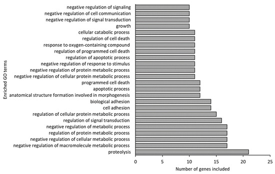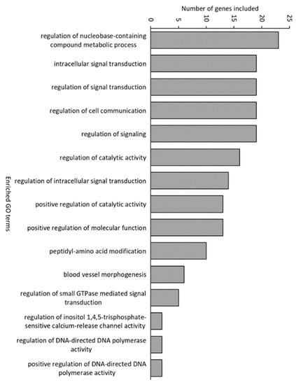 For samples from 16 dph, 82 genes were downregulated and 97 were upregulated in conventional larvae compared with germ-free larvae. In gnotobiotic larvae, only 23 were downregulated and none were upregulated compared with germ-free larvae (Supplementary Tables S1–S3). Gnotobiotic and germ-free larvae generally showed similar expression profiles. Of the genes that were upregulated in conventional compared with germ-free larvae, 74% were also upregulated compared with gnotobiotic larvae (Supplementary Figure S4). Many of the genes that were upregulated in conventional compared with germ-free larvae are involved in innate immune responses and linked to signalling and glucose transport. Examples for immunity are, e.g., interleukin 8 (cxcl8), leukocyte cell-derived chemotaxin 2 (lect2) and interleukin-1 receptor-activated kinase (irak1), and for signalling/transport are, e.g., solute carrier family 2 facilitated glucose transporter member 11-like (slc2a11) and solute carrier family 2 facilitated glucose transporter member 4-like (slc2a4). Biological term enrichment analysis and Gene Ontology term (GO term) annotation in DAVID showed that 15 GO terms were enriched in conventional fish compared to germ-free fish (Figure 4). Several of the enriched GO terms, including the one with the highest number of genes (“regulation of nucleobase-containing metabolic process”), were related to growth and cell division. Other enriched GO terms were related to signalling and cell communication. Most of these GO terms were also enriched compared with gnotobiotic larvae (Supplementary Table S4). The KEGG pathway “bacterial invasion of epithelial cells” was enriched in conventional larvae compared with both gnotobiotic and germ-free fish.