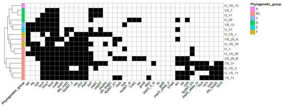 Heatmap representing presence/absence matrix of putative virulence genes among urogenital E. coli from different phylogenetic groups. The dendrogram in the left represents clustering of isolates based on Euclidean distance. Presence or absence of virulence genes is represented as black or white squares, respectively. The right hand side of the figure contains the list of unique E. coli profiles coded with U (for urinary) or VS (for vaginal swab) for origin and a number for identification of donor, according to Table 1.
