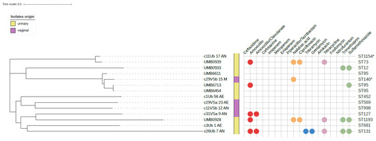 Phylogenetic tree representing core genome SNPs alignment of 14 urogenital E. coli strains isolated from asymptomatic women (8 from our study and 6 from Garretto et al.). The alignment was performed using E. coli strain UTI89 as a reference. The tree is unrooted. Colored balls represent the resistance phenotype/genotype to a given antibiotic (colors by antibiotic class). Resistance of the strains originated from this study was characterized by phenotypic and genotypic methods, while strains from Garretto et al. were characterized genotypically. Single locus variants (SLV) are represented with an asterisk (see Table 1).