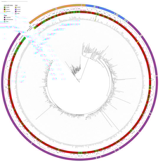 A total of 19,737 assemblies were subjected to mlst 2.19.0 pipeline [41] (https://github.com/tseemann/mlst, accessed on 10 February 2021) to access STs of public genomes. Genomes (n = 1084) that represented the same STs as those detected in our collection were extracted. Only the genomes from humans and those with available metadata on host health status and isolation source were considered. Following these criteria, we grouped isolates according to host health status (healthy-H or diseased-D) and origin (urogenital tract, gastrointestinal tract or other isolation source). Additionally, complete genomes of well-known reference strains for certain ST were included in the analysis.