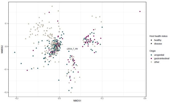 We then examined strains similarity according to their accessory genome (Figure 4). The NMDS ordination based on a 28,542 accessory gene matrix demonstrated three different clusters that are likely to correspond to clades A, B and C (from the right to the left, respectively; Figure 4), irrespective of host health status or the isolate’s origin. The urinary strain c26Ub_7_AN isolated from healthy woman was identified in the proximity of two clusters.