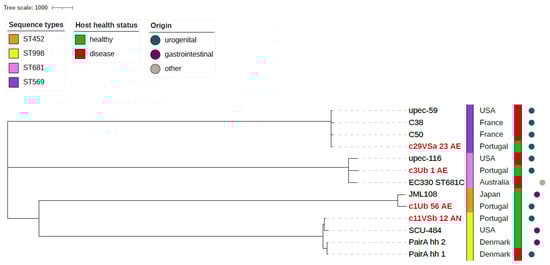 Whole genome SNPs phylogenetic tree of 4 infrequent E. coli STs (ST452, ST569, ST681, ST998) including 4 from our urogenital collection (marked in red) and 9 genomes retrieved from NCBI database. The alignment was performed using E. coli strain 536 as a reference. The tree is unrooted. Information on ST, health status of the host and origin of the strains is incorporated in the tree.