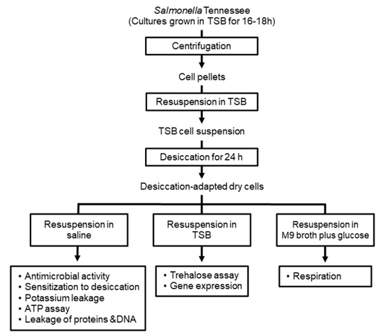 Desiccation-adapted Salmonella Tennessee cells were prepared as described previously [9] with modifications. Briefly, S. enterica cells were grown overnight in Tryptic Soy broth (TSB; Becton Dickinson, Sparks, MD, USA) at 37 °C to a cell density of 109 CFU/mL, as determined by plating on Tryptic Soy agar (TSA; Becton Dickinson). Cells of the incubated cultures were harvested by centrifugation at 4 °C and 8000× g for 5 min, and finally resuspended in fresh TSB. Aliquots (l mL, each) from cell suspensions were placed in empty plastic Petri dishes (90 mm diameter; VWR International, Radnor, PA, USA) with a final population of 109 CFU per plate, and air dried in a biosafety cabinet for 24 h at 22–25 °C under ca. 40% relative humidity; survivors are considered desiccation-adapted cells. The adapted cells were collected by dispensing 1 mL of the resuspension medium onto the dried cells. The resuspension medium was saline (0.85% NaCl), TSB, or M9 minimal medium supplemented with glucose, depending on the medium required in a given experiment, to obtain desiccation-adapted cell suspension (Figure 1). Resuspension of desiccation-adapted cells in saline solution was suitable in challenge experiments to study resistance of desiccated Salmonella cells to membrane-active antimicrobials [9]. TSB or M9 medium with glucose was used in the current study under circumstances where desiccated cells needed to express some metabolic activities [3,4,9].