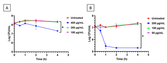 Changes in populations of desiccation-adapted Salmonella Tennessee E2007000304 when exposed to different concentrations of carvacrol (panel (A)) or thymol (panel (B)) for up to 4.0 h at 22–25 °C. Each data point represents mean ± standard deviation. Asterisk (*) denotes significant difference (p < 0.05) after 4.0 h of incubation.