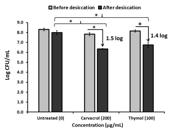 Changes in populations of desiccation-adapted Salmonella Tennessee E2007000304 when treated with 200 and 100 µg/mL of carvacrol and thymol, respectively, for 120 min at 37 °C and followed by desiccation for 24 h at 22–25 °C. Each data point represents mean ± standard deviation. Asterisk (*) denotes significant difference at p < 0.05.