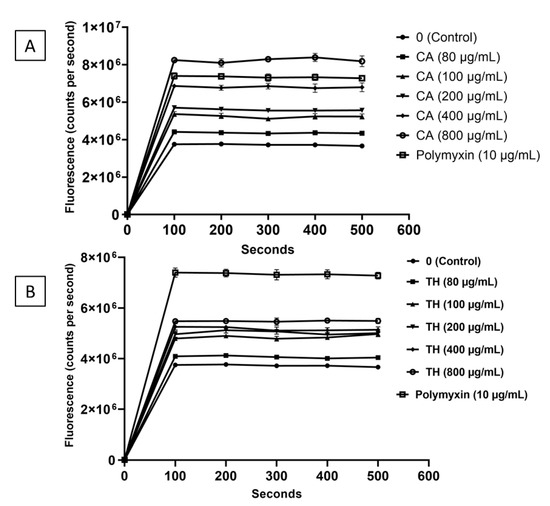 Release of the intracellular potassium ions from desiccation-adapted Salmonella Tennessee E2007000304 when treated with different concentrations of carvacrol (panel (A)) or thymol (panel (B)); polymyxin (10 µg/mL) was used as a positive control. The release of intracellular K+ was measured as changes in fluorescence at 505 nm. Each data point represents mean ± standard deviation.
