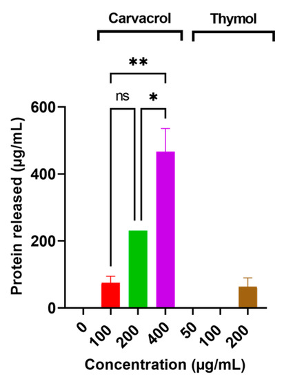 Release of the intracellular protein from desiccation-adapted Salmonella Tennessee E2007000304 when treated with different concentrations of carvacrol or thymol for 2.0 h at 37 °C. Each data point represents mean ± standard deviation. Asterisk (*) denotes significant difference at p < 0.05; and ** at p < 0.01. “ns” denotes non-significant (i.e., p > 0.05).