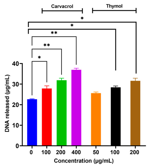 The ability of carvacrol and thymol to induce potassium leakage prompted us to investigate the capability of these additives to invoke the leakage of intracellular macromolecules, such as proteins and nucleic acids. Results showed that carvacrol caused leakage of intracellular proteins in a concentration-dependent manner (p < 0.05) as shown in Figure 5. However, thymol at 200 µg/mL only caused leakage of intracellular proteins (Figure 5). Both carvacrol and thymol induced leakage of intracellular nucleic acids in a concentration-dependent manner (p < 0.05; Figure 6). There were no sizeable differences (p > 0.05) when the two additives were compared for their ability to induce leakage of the intracellular nucleic acids.