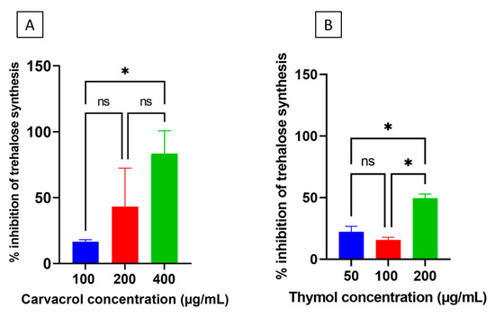 Inhibition of trehalose biosynthesis (per cent) in desiccation-adapted Salmonella Tennessee E2007000304 after treatment with different concentrations of carvacrol (panel (A)) or thymol (panel (B)) for 12 h at 22–25 °C. Each data point represents mean ± standard deviation. Asterisk (*) denotes significant difference at p < 0.05. “ns” denotes non-significant (i.e., p > 0.05).
