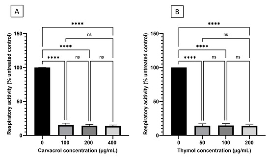 Changes in the respiratory activity of desiccation-adapted Salmonella Tennessee E2007000304 after treatment with different concentrations of carvacrol (panel (A)) or thymol (panel (B)) for 22 h at 37 °C. Each data point represents mean ± standard deviation. Asterisks (****) denote significant difference at p < 0.0001. “ns” denotes non-significant (i.e., p > 0.05).