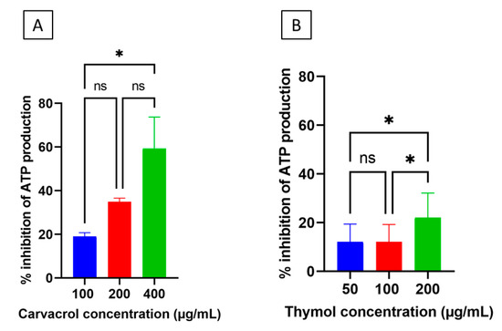 Inhibition of adenosine triphosphate (ATP) production in desiccation-adapted Salmonella Tennessee E2007000304 after treatment with different concentrations of carvacrol (panel (A)) or thymol (panel (B)) for 2.0 h at 37 °C. Each data point represents mean ± standard deviation. Asterisk (*) denotes significant difference at p < 0.05. “ns” denotes non-significant (i.e., p > 0.05).