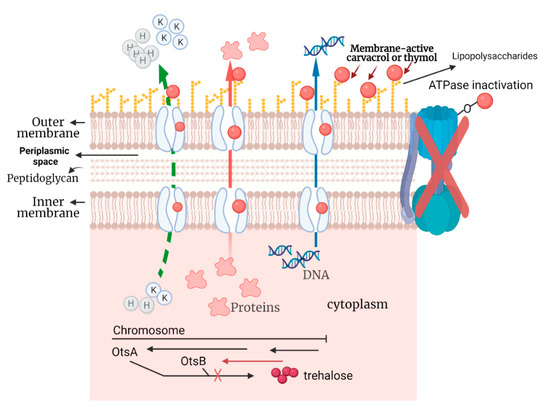 The proposed mechanism of action of carvacrol or thymol against desiccation-resistant Salmonella is presented schematically in Figure 10. Briefly, the interaction of carvacrol or thymol with the cytoplasmic membrane of desiccation-resistant Salmonella Tennessee permeabilizes the cells, causing leakage of the intracellular small ions, such as K+, whose intracellular accumulation is needed as a primary event in resistance to desiccation. With the increase in cell-membrane permeability, efflux of other intracellular molecules, such as DNA and proteins, starts. Compromising the cytoplasmic membrane permeability could also alter the proton motive force and reduce respiration. Additionally, the phenol group of carvacrol or thymol may interact with ATPase, causing its inactivation. Several other direct or indirect cascades of events could affect the transcription of genes necessary for desiccation adaption; however, this inference needs future research.
