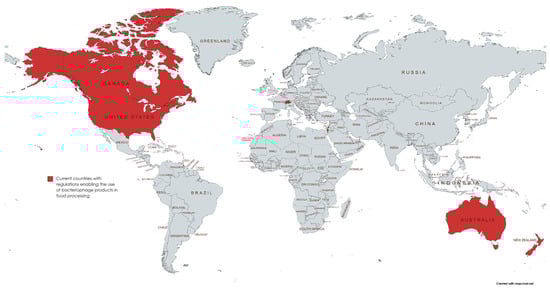 While there have been various approaches to reduce usage through diet control, feeding of probiotics and the use of vaccines, a particular approach that is gaining interest is the use of bacteriophages to target bacteria. Bacteriophages, more commonly referred to as phages, are a class of viruses discovered for their bactericidal effects even before the discovery of penicillin and other antibiotics. However, due to the ease of use and importance of antibiotics in World War II, research on bacteriophages stagnated until the recent postantibiotic era and the increasing severity of AMR. As viruses that target only a specific family of bacteria, phages effectively kill colonies of infection-causing bacteria while ignoring other beneficial microorganisms and cells. Regulations for phage therapy for human application are strict due to limited clinical trials on the safety of humans; however, several countries have passed regulations allowing for the use of phage therapy in food processing and agriculture (Figure 1). While there are currently no regulations allowing for phage product use within the European Union, phage products are allowed on food exports to countries where it is authorized. Health Canada has issued Letters of No Objection for bacteriophage mixtures against Escherichia coli (E. coli), Salmonella enterica (Salmonella) and Listeria monocytogenes (Listeria) as processing aids for the removal of pathogenic Salmonella from meat products post-slaughter and processing []. EcoShieldTM and PhageGuard ETM, among other bacteriophage mixtures against E. coli, Salmonella and Listeria, are approved in the United States by the FDA for use in packaged meat and food products. As more investigations and assessments on the risks of phage therapies are conducted, it will not only improve the situation of AMR in the food supply chain but also provide evidence for the potential safety of use in treating bacterial infections in humans.