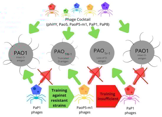Training of strains effective against phage-resistant bacterium employing truncated O-antigen as a resistance mechanism. Phage cocktails demonstrate effectiveness against all wild-type and resistant strains tested.