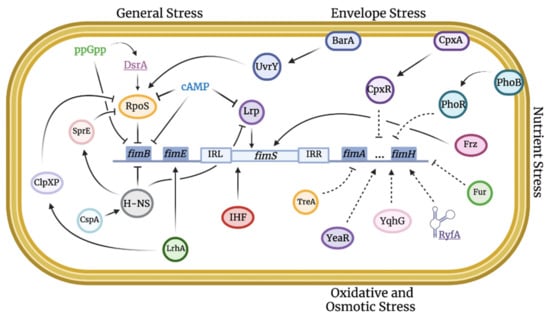The stress response can be defined as the change in gene expression of bacteria for an optimal environmental adaptation. These changes can be controlled by a specific sigma factor (e.g., master regulator, heat shock response) or another transcriptional regulator (e.g., SoxR/S or OxyR), a two-component system, the nutritional starvation response (the stringent response), or small RNAs []. These regulators can mediate changes in bacterial gene expression to adapt to stress. Some affected genes are implicated in virulence, such as type 1 fimbriae. As type 1 fimbriae play a key role in mediating E. coli host colonization and virulence, it is important to understand the regulation of these fimbriae in relation to stress responses. Indeed, numerous regulators (Figure 1) and growth conditions (Figure 2) have been identified that can affect the production of type 1 fimbriae. Below we present regulators that can play important roles in global stress regulation but have also been shown to affect expression of type 1 fimbriae (Table 1 and Table 2).