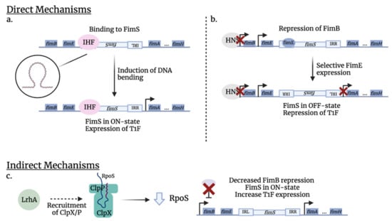 LrhA: LrhA is a transcriptional regulator of the LysR family involved in flagellar motility and fimbrial genes. Regarding type 1 fimbriae, LrhA indirectly affects fimS phase variation by promoting fimE transcription (Table 2). By analyzing quantitative RT-PCR results, Blumer and others have demonstrated that levels of fimE transcripts decrease in LrhA mutants, leading to increased type 1 fimbrial expression. Further investigation showed that even though LrhA can bind to promoter regions of fimA, fimB, and fimE, it has the highest affinity for the fimE promoter and only directly affects fimE transcription. In other words, these results suggest that LrhA represses type 1 fimbrial expression by promoting fimE transcription []. Interestingly, LrhA also functions as a regulator of RpoS. More specifically, it promotes RpoS degradation by affecting the activity of the protease, ClpXP []. Therefore, LrhA also indirectly links environmental stress and the expression of type 1 fimbriae through modulation of the RpoS network.