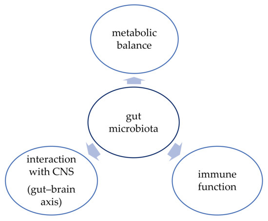 The function of human gut microbiota has been an object of interest of many studies conducted in the last few years. The function of the gut microbiota is shown in Figure 1. The microbiota proved to have a vital role in maintaining metabolic balance and proper function of the immune system, but there is also evidence that it can influence brain development and neurogenesis and that it interacts with the central nervous system (CNS) via the “gut–brain axis” [44]. Therefore, better understanding of this complex system might bring promising therapeutic options not only for obesity but also for depression, inflammatory bowel diseases (IBD), or cancer, for example [37].