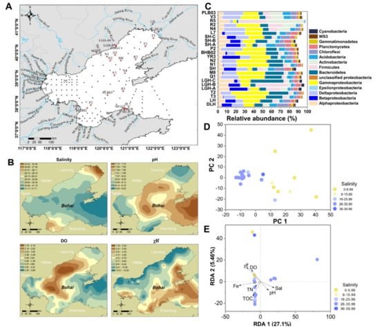 Study area, environmental variables, and microbial community composition. (A) A map of the study area. Black dots denote sampling sites. The letters denote site names. Red “⊕” indicates sites chosen for further study of microbial community structure, including Daliao River sites (DLH), Liao River (LH), Liugu River sites (LGH-A, LGH-B, and LGH-C), Shi River site (ShiH), Yellow River site (YR), Sha River sites (SH-A, SH-B, and SH-C), and sample sites located in the Bohai Sea (Q1, M8, T3, T2, N1, N2, L7, BHB02, PLB03, V3, N4, R2, R3, and R5). (B) Maps showing salinity, dissolved oxygen (DO), low-frequency magnetic susceptibility (χlf) of the sediment, and pH of the overlying water across the Bohai Sea. The maps were constructed using ArcGIS 10.0 software. (C) Microbial community composition in the study area at the phylum level (Proteobacteria showed by classes). (D) Principal component analysis (PCA) plot based on an OTU-based Bray-Curtis dissimilarity metric derived from the freshwater and marine sediment samples. (E) Redundancy analysis (RDA) plot of the bacterial communities and the main environmental characteristics.