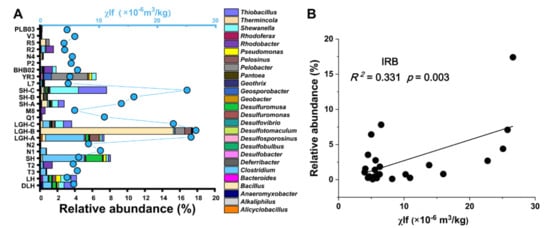 We also analyzed the relation between the IRB and χlf in correlation assay. IRB are a group of microorganisms that could reduce amorphous Fe (III) oxides under anaerobic conditions [,]. We chose the reads classified as IRB in the literature [,] to analyze the relationship between χlf and IRB community composition. Differences in χlf between sediment samples showed a close relationship to the relative abundance of total identified IRB (Figure 2A). Regression analysis showed a linear relationship between χlf and the relative abundances of total IRB (R2 = 0.331, p = 0.003) (Figure 2B).