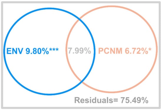 The distance–decay model was constructed by fitting the bacterial community Bray-Curtis similarity and geographical distance. Variation partitioning analysis (VPA) based on RDA was employed by the “varpart” function of the vegan package to assess the relative importance of the geographic distance and environmental variables in shaping the bacterial community [], and 1000 bootstrap resampling was performed to calculate standard deviation []. Spatial variables were generated by the principal coordinates of neighbor matrices (PCNM) method based on latitude and longitude [] using the PCNM package in R. The variation of the bacterial community composition between the spatial and environmental variables was partitioned by RDA. VPA decomposes the variation into fractions explained by pure environmental variables, pure spatial factors (PCNM variables), spatially structured environmental variation (shared fraction), and unexplained variation.