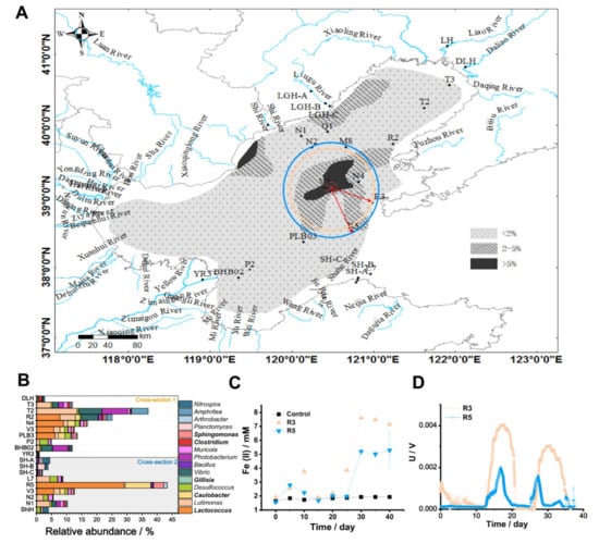 A previous study of the sedimentary magnetite distribution in the gulf of Bohai Sea showed a high content of magnetite exposure at the site of 120.4° E, 39° N [] (Figure 5A). To determine whether distance from the center of the magnetite influenced the microbial community structure, we analyzed the relationship between the relative abundances of the top 15 genera from the two cross-section samples (Figure 5A,B) and the distances from these samples to the center of magnetite. Five genera, including Lactococcus (R2 = 0.220, p = 0.043), Caulobacter (R2 = 0.217, p = 0.045), Gillisia (R2 = 0.366, p = 0.006), Clostridium (R2 = 0.372, p = 0.006), and Sphingomonas (R2 = 0.255, p = 0.027) (Table 3) were found correlated with the distances from these samples to the center of magnetite. This suggests that there might be a nonrandom distribution in a horizontal orientation. The distribution of these five genera in the horizontal direction was related to the distance from the magnetite center. We speculate that the presence of magnetite produces a certain magnetic field that changes the community structure of some microbes such as DIRB. We randomly selected two sites (R3 and R5) from outside the magnetite center (R3 > R5, distance to center of magnetite) (Figure 5A), and cultured the sediments of R3 and R5 with amorphous iron (Figure 5B). The results showed that the Fe (II) content produced by the reduction of amorphous iron by the R3 culture was 7.69 mM, and the Fe (II) content produced by the R5 culture was 5.28 mM. These two enrichments were used to perform microbial fuel cells (MFC) (Figure 5C). The reactor inoculated with microorganisms from the R3 enrichment culture showed a high peak voltage of 4.02 mV. Low peak voltage of 1.99 mV was observed in the reactor inoculated with R5 enrichment culture (Figure 5D). The peak voltage of R3 was higher than that of R5. It is consistent with the distance changes of R3 and R5 to point (120.4° E, 39° N). This result showed that in the Bohai Sea sediments the closer to the magnetite center, the stronger the ability of the community to facilitate extracellular electron transfer was. This suggests that the magnetic field strength may affect the electroactivity of microbes in enrichment.